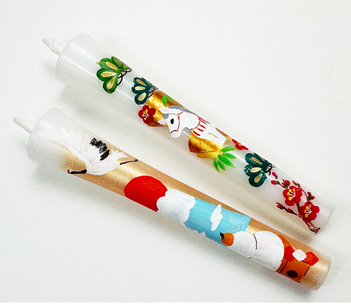 2026年の干支「馬」と縁起物を描いた絵ろうそく。