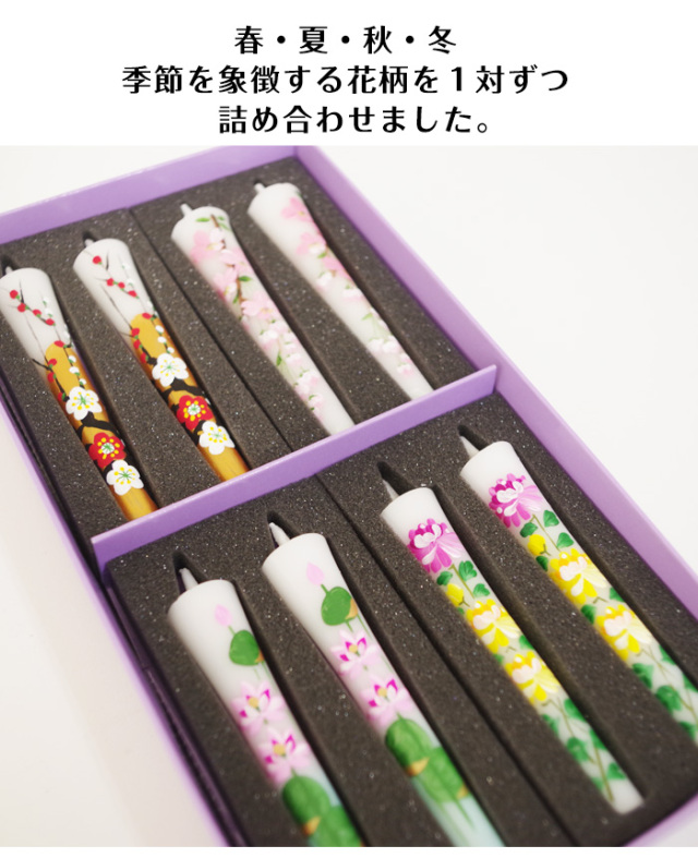 春夏秋冬を象徴する花柄を一対ずつ詰め合わせ。