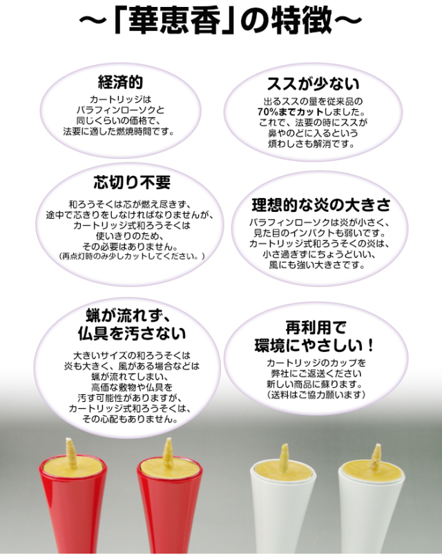 | 製品名: | 送料無料 30号 お寺用 カートリッジ式 和ろうそく 華恵香DX 2本セット(本体) |