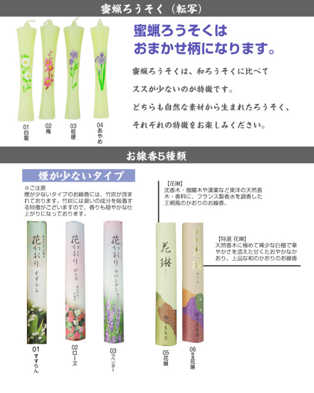 | 製品名: | 新・花琳蜜蝋ミニセット |