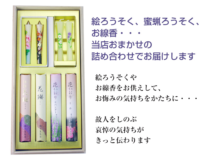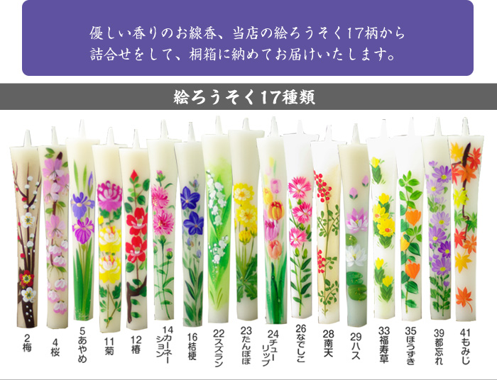 絵ろうそくは、お仏壇のお花の代わりをするという意味合い。 夏場、お花が傷みやすい時期にお仏壇が華やかになります。 四季のお花の中から4本お好きなお花を選べます。 お盆、初盆のお供え、新盆見舞いに好適品です。